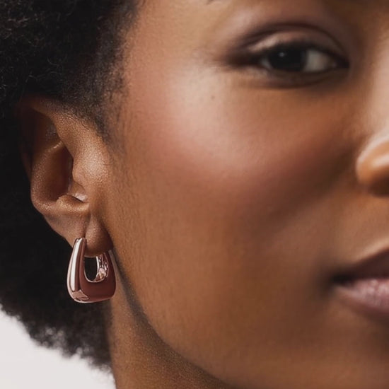 Avec leur forme triangulaire arrondie et leur fini plaqué or rose effet miroir, ces boucles d’oreilles captent la lumière avec une douceur éclatante, offrant un reflet chaud et féminin à chaque mouvement.