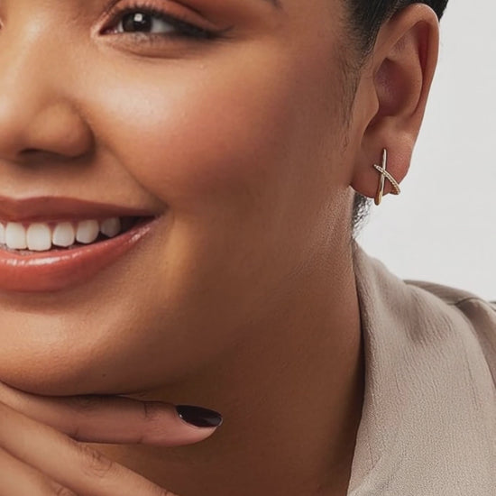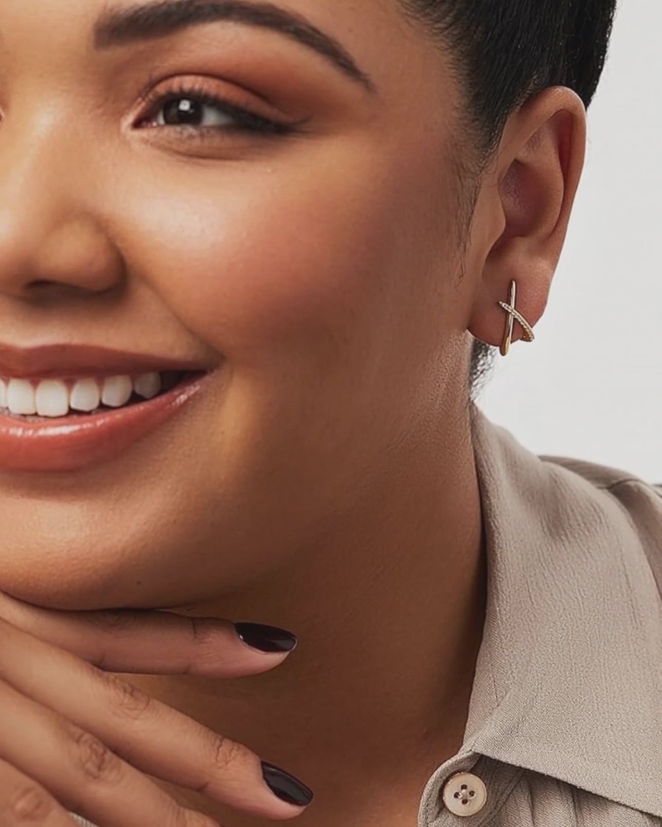 Conçues avec un fini plaqué or jaune éclatant et sublimées par un pavage délicat de zircons brillants, ces boucles d’oreilles captent la lumière à chaque mouvement. Leur courbe croisée, fine et moderne, épouse parfaitement le lobe pour offrir un confort exceptionnel et un éclat sophistiqué qui illumine toutes les carnations.